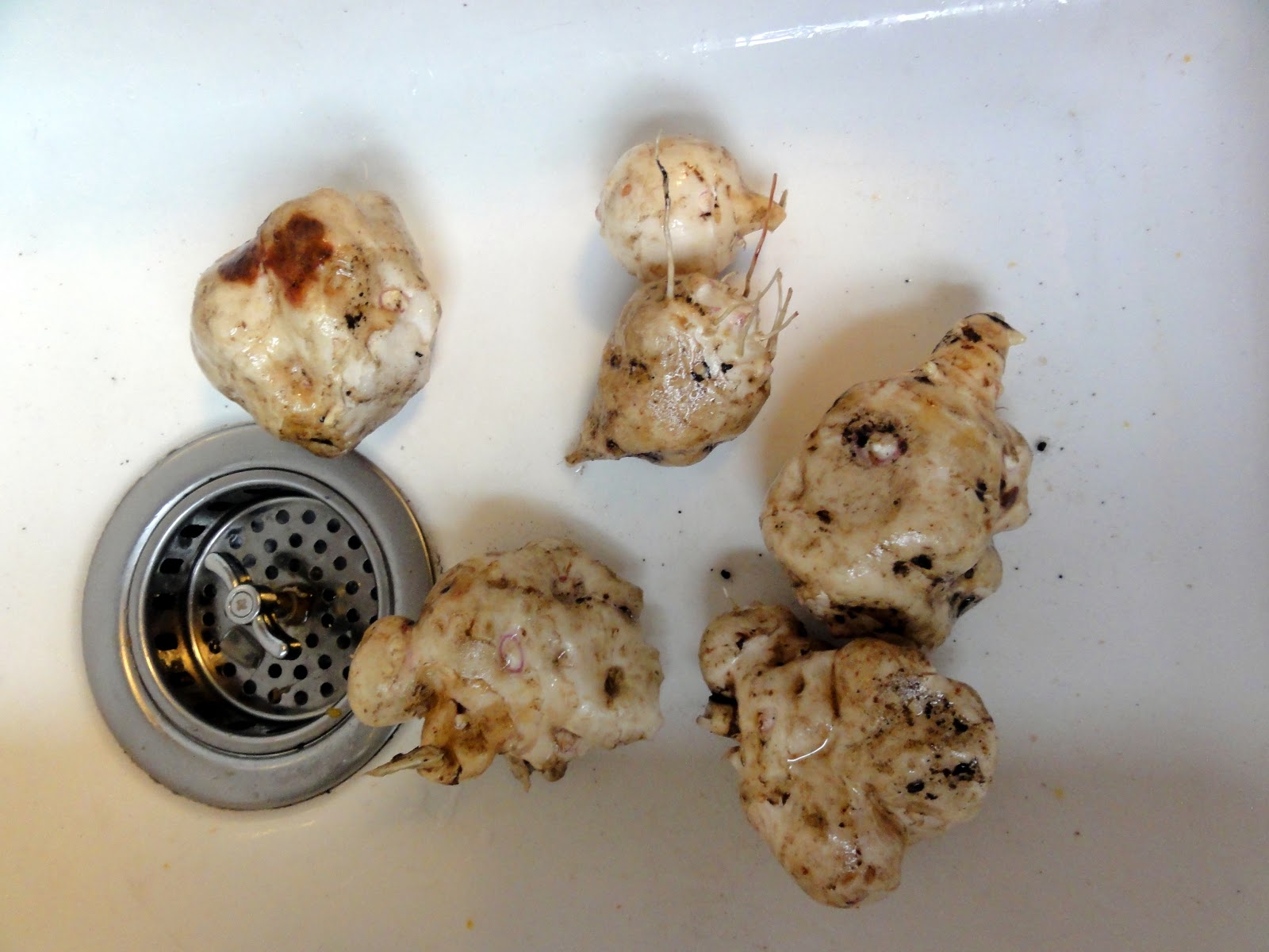 Here they are in my sink. Mostly clean. Pretty knarly looking! I hope they taste better than they look. I peeled them into a more round shape, smoothing out the knobs. I used a vegetable peeler as well to make the slices for frying. I sliced them to about 1/8". Thin enough to see through them.